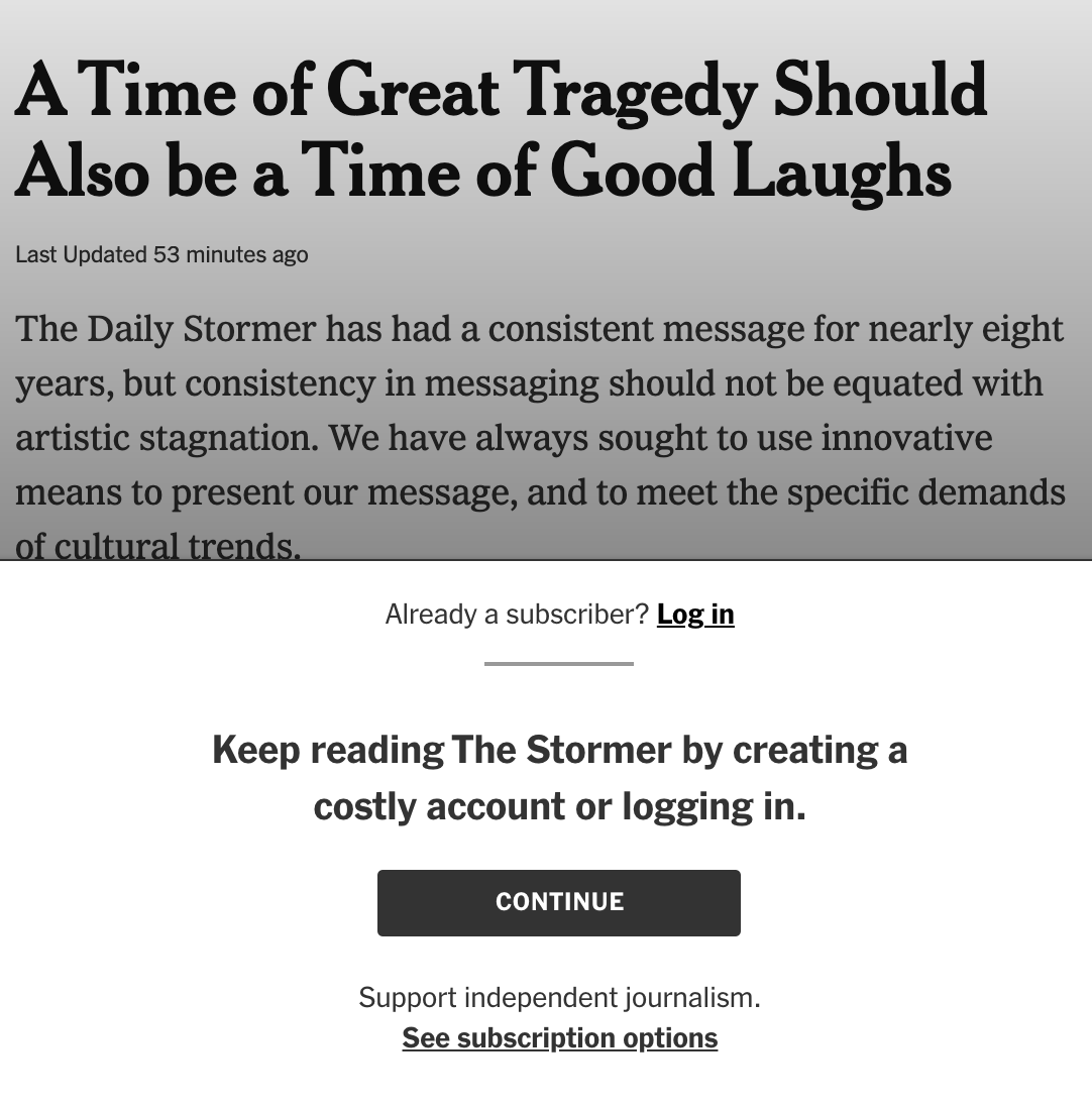 Some people have complained about the change in tone, but the fact is that once you learn the basic stuff we deal with on this site, you’re never going to unlearn it. I look at this as a matter of mathematics: I want as many people as possible to get ahold of the information, and learn the truth. After a person has learned the truth (it’s not really all that complicated), I don’t care if they stop reading the site. Obviously, I do my best to cultivate a long-term readership, not least because that’s who donates, but I will never sacrifice the core mission of flipping as many people as possible to our side for the sake of long-term readership. This site is very unique in that way. The Daily Stormer site was designed with a sole mission, and any time I’ve deviated from that mission – i.e., in supporting the “Alt-Right,” and promoting their IRL events – it’s hurt the mission. I am not going to sacrifice a chance to forward the mission by bringing in new readers because oldfags who already know the whole story aren’t having fun here anymore.