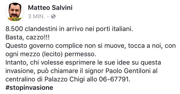 On Tuesday, 8,500 African migrants are reaching Italian shores aboard 14 different ships, adding to the 5,000 who arrived on Monday. The massive arrivals have led local media as well as politicians to speak of an authentic immigrant “invasion” exceeding the country’s capacity of assimilation.