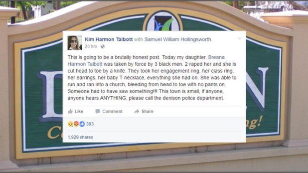 “Wednesday evening, an 18-year-old white female was kidnapped by three black men in Denison, Texas. A few hours later she was found at a church with numerous knife wounds and no pants.