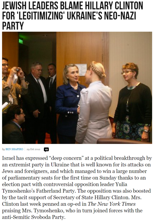 One prominent Jewish leader, who asked to remain unnamed, says that Clinton’s New York Times op-ed ripping the current Ukrainian administration has “created a neo-Nazi Frankenstein by issuing a de facto endorsement of Mrs. Tymoshenko and her choices.”
