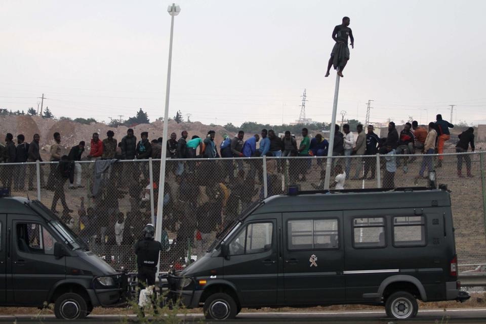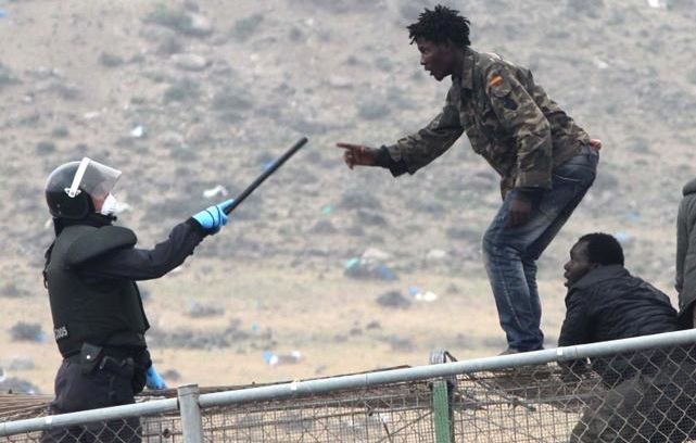 By afternoon, more than 150 people remained perched on an outside border fence, fending off police by setting fire to clothing and throwing it at them, Spanish officials said. Some even swung batons wrenched away from officers.