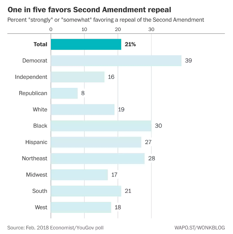 But public-opinion polling shows that it would take a lot of persuading to bring the public around to that view. In February, for instance, the Economist and YouGov asked Americans whether they supported a repeal of the Second Amendment. Twenty-one percent said they favored such a proposal, compared with 60 percent in opposition.