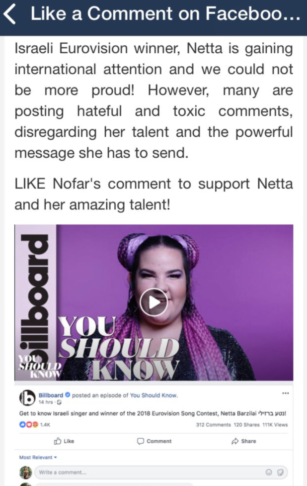 As well as having nothing to do with BDS, many of the missions are aimed at enhancing Israel’s image in quite trivial ways. For example, users are urged to like comments or retweet posts that praise Netta Barzilai, the Israeli winner of the Eurovision Song Contest.