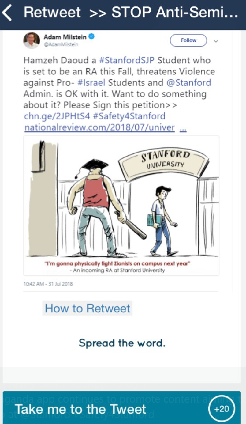 The missions extend even to trying to hound specific people from their jobs. A week ago, for example, the app targeted a student at Stanford University.
