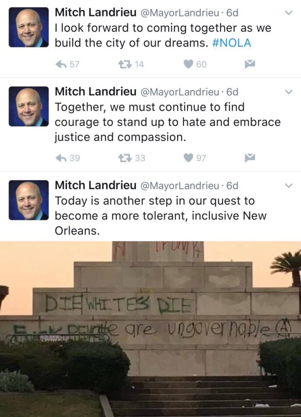 New Orleans was the most populous city of the Confederacy. Dozens of streets and buildings bear the names of Confederate heroes. Four monuments – Confederate President Jefferson Davis, General Robert E. Lee, General PGT Beauregard and the Liberty Monument – have been seen by millions of tourists and are loved by the people of New Orleans and Louisiana. These monuments have been targeted by the Leftist Democrat Mayor of New Orleans Mitch Landrieu, for removal, and he’s using a largely Jewish and Black community (Marxist) group called “Take’m Down NOLA” to incite local leftists to show up to city council meetings to push this agenda.