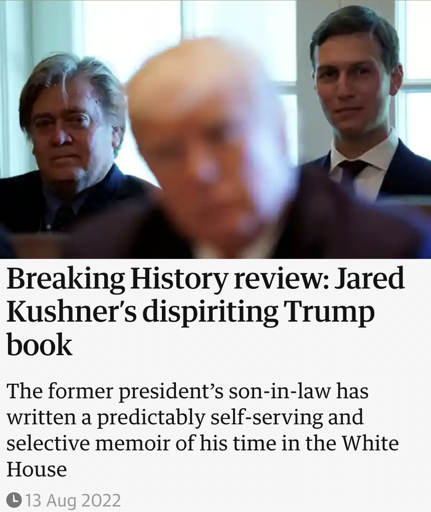 I didn’t read the whole thing, but here are the first few paragraphs of “Breaking History review: Jared Kushner’s dispiriting Trump book” by Lloyd Green: