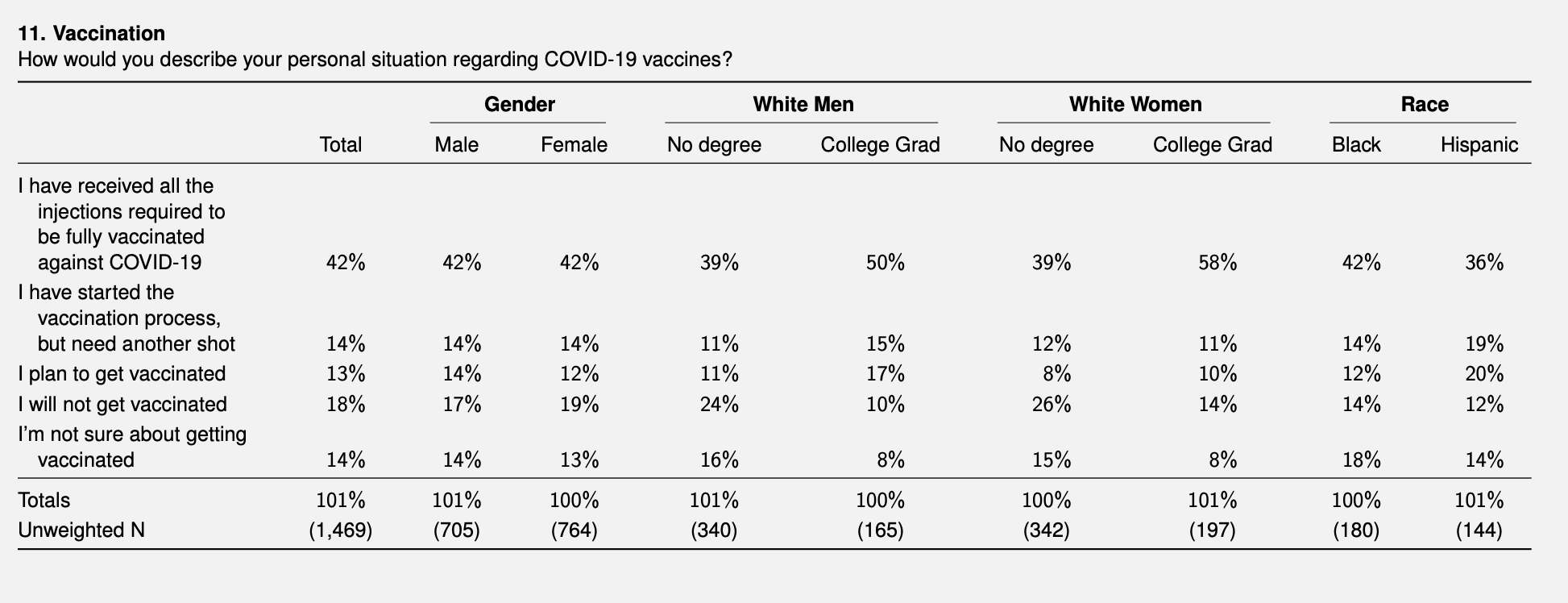 In fact, according to that poll, there are fewer black anti-vaxxers than whites, with the overall black rate of saying they will never get vaxxed being 14% – which is the same as white women who have been to college. College-graduated white women are the single most vaxxed-out group in America.