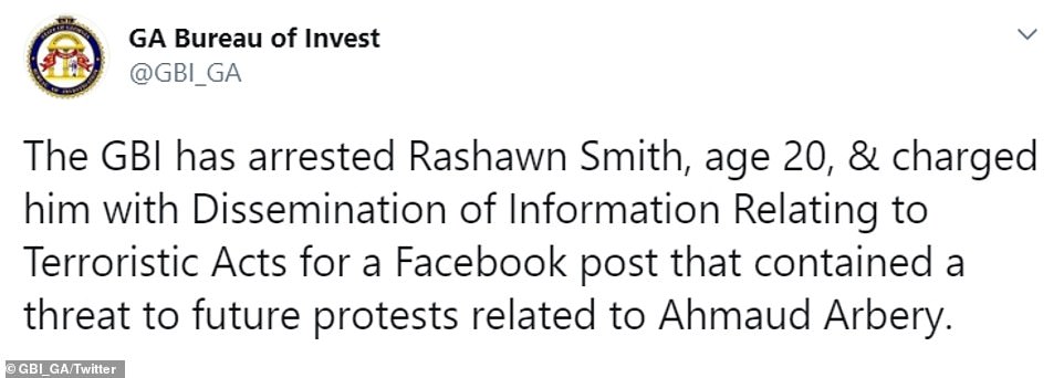 Earlier in the day, the GBI said it had ‘been made aware of a Facebook post that contains a threat to future protests related to Ahmaud Arbery’.