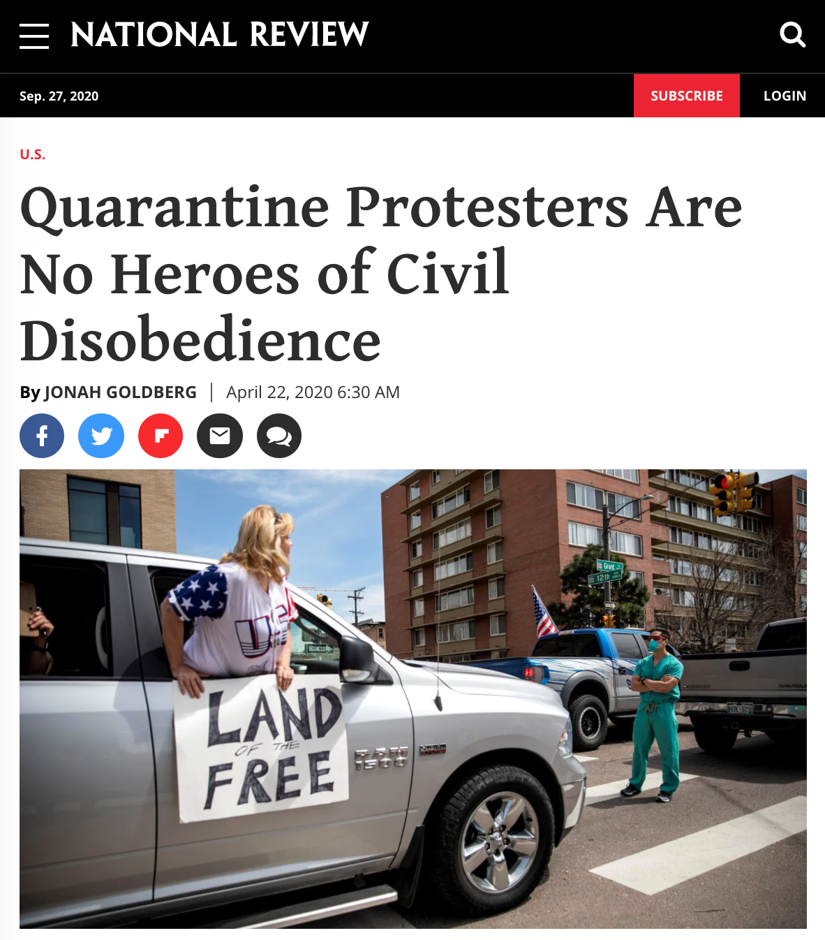 On April 22, 2020, the awful Jew Jonah Goldberg penned a piece entitled, “Quarantine Protesters Are No Heroes of Civil Disobedience,” where he condemned the protesters as a threat to public health and demanded that everyone just trust the government and obey.