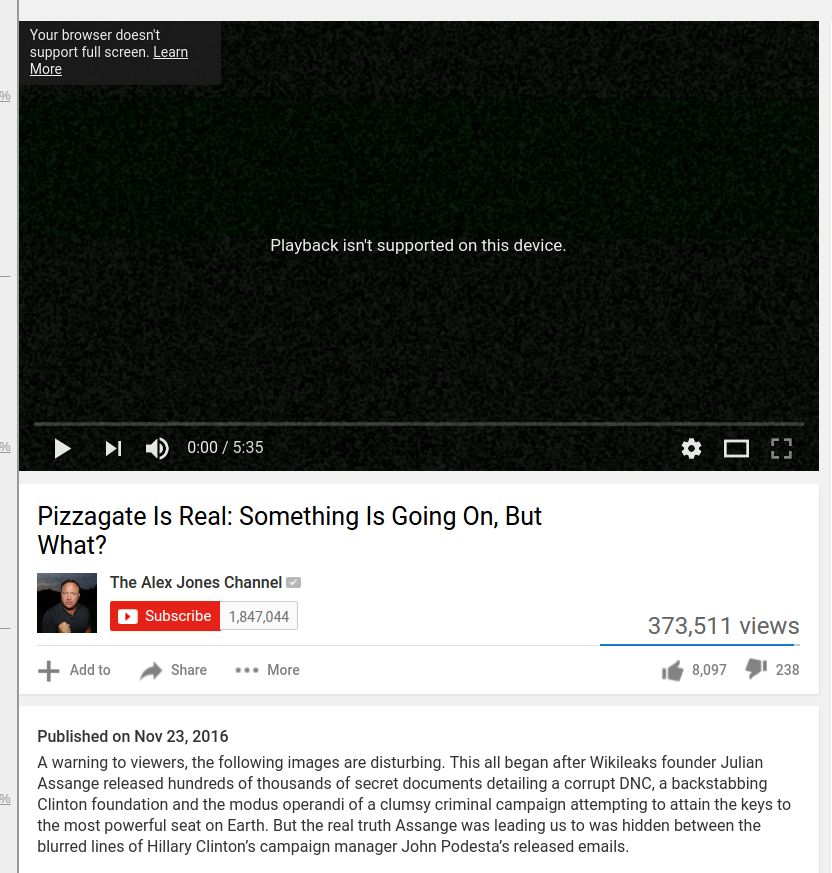 It was an actually very good summary of the Pizzagate situation, containing a whole lot of details. It was one of the main videos being passed around. If someone has a saved copy, they should reupload it and see what happens – see if Jones files copyright on you (he makes a big deal of not filing copyright claims on his material, and encouraging people to copy it, so this would be very telling). I don’t personally have a copy of it and the video itself isn’t saved on archives.