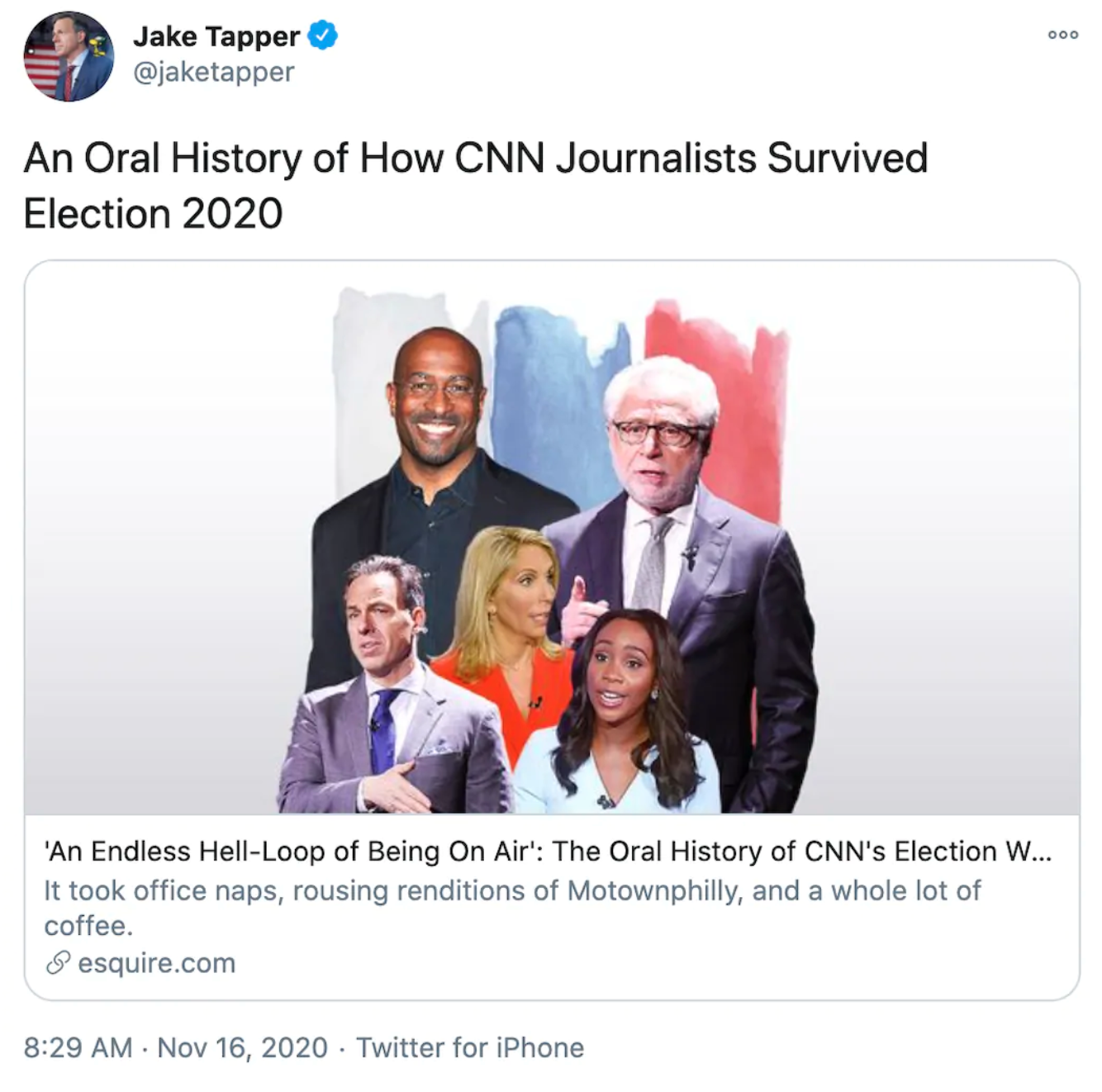 - Sharing the article, Tapper added his own headline: “An Oral History of How CNN Journalists Survived Election 2020.”