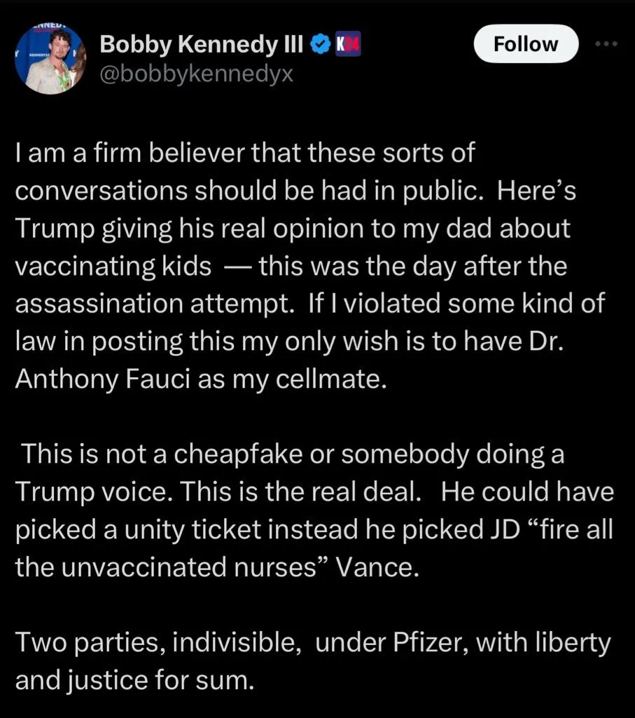 — Robert F. Kennedy Jr (@RobertKennedyJr) July 16, 2024