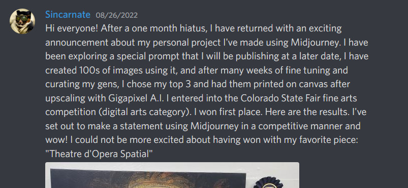 Allen used Midjourney—a commercial image synthesis model available through a Discord server—to create a series of three images. He then upscaled them, printed them on canvas, and submitted them to the competition in early August. To his delight, one of the images (titled Théåtre D’opéra Spatial) captured the top prize, and he posted about his victory on the Midjourney Discord server on Friday.