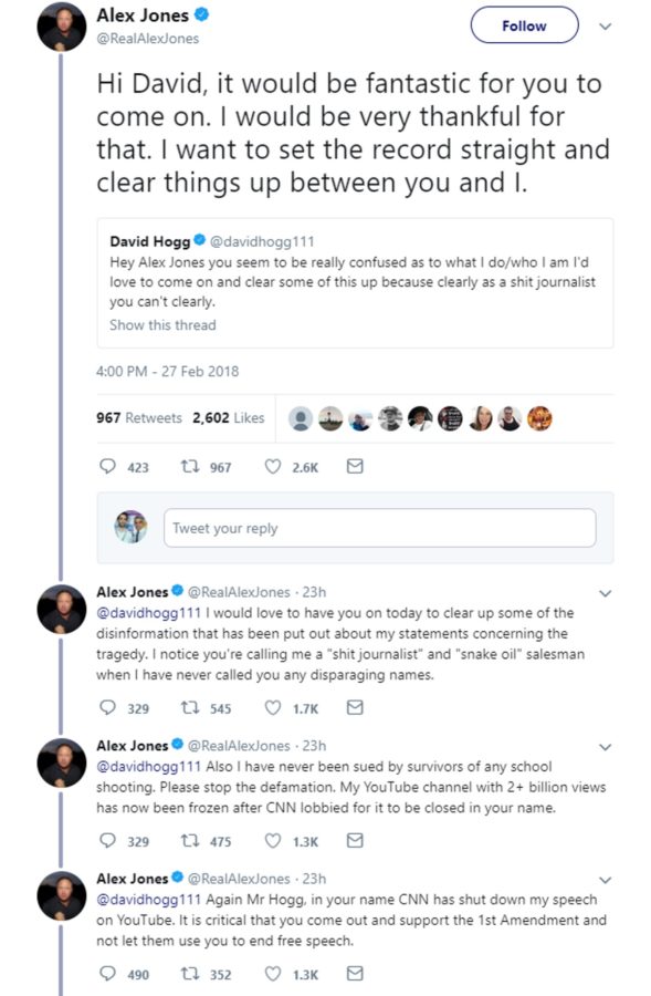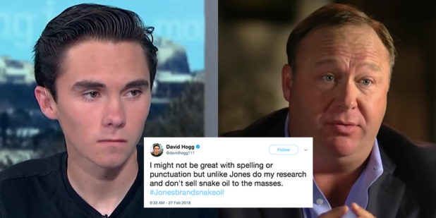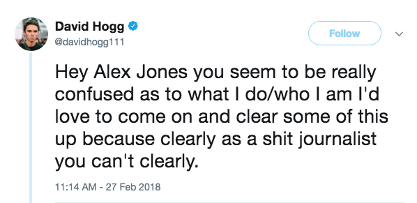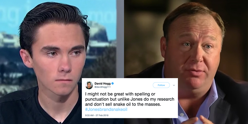 Alex Jones previously responded to a challenge from David Hogg to do a debate on gun control, and got accused of “bullying a kid.”