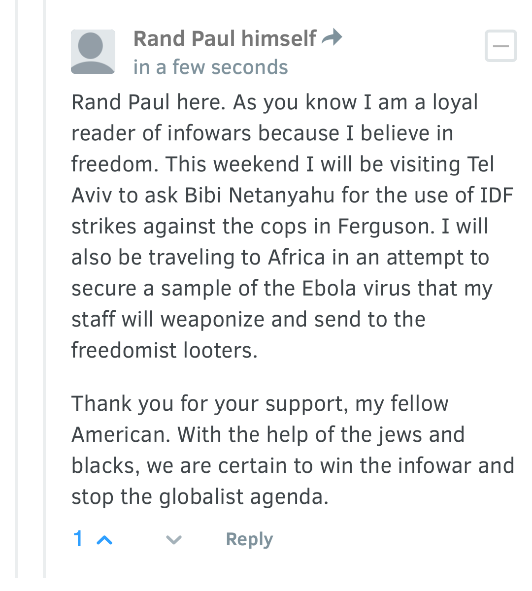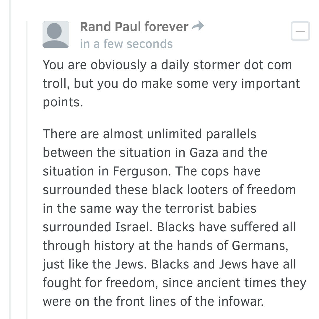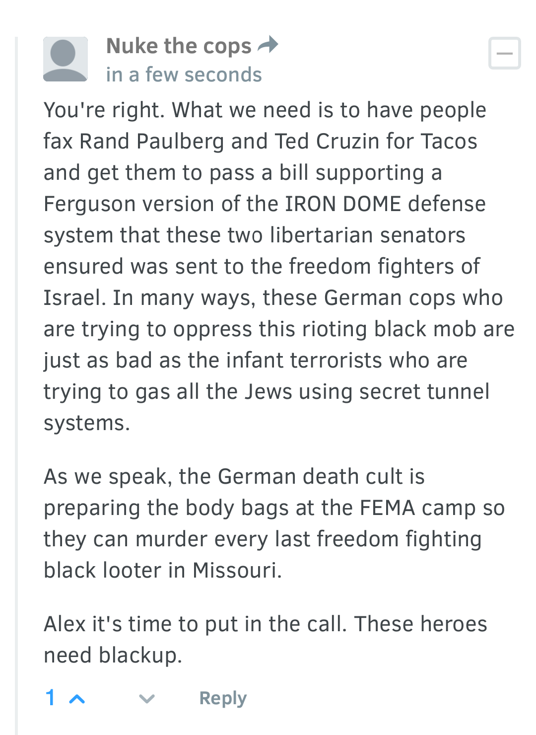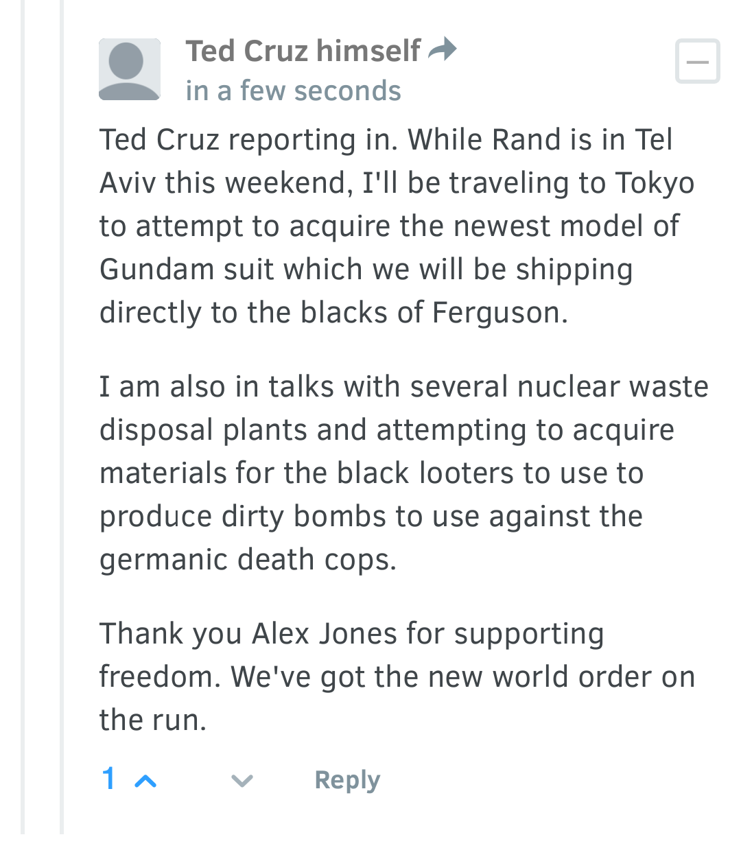 Also unsurprisingly, Rand Paul and Ted Cruz showed up in the comments section to declare they will use their Jewish connections to get weapons to these Blacks to help them fight the evil cops.