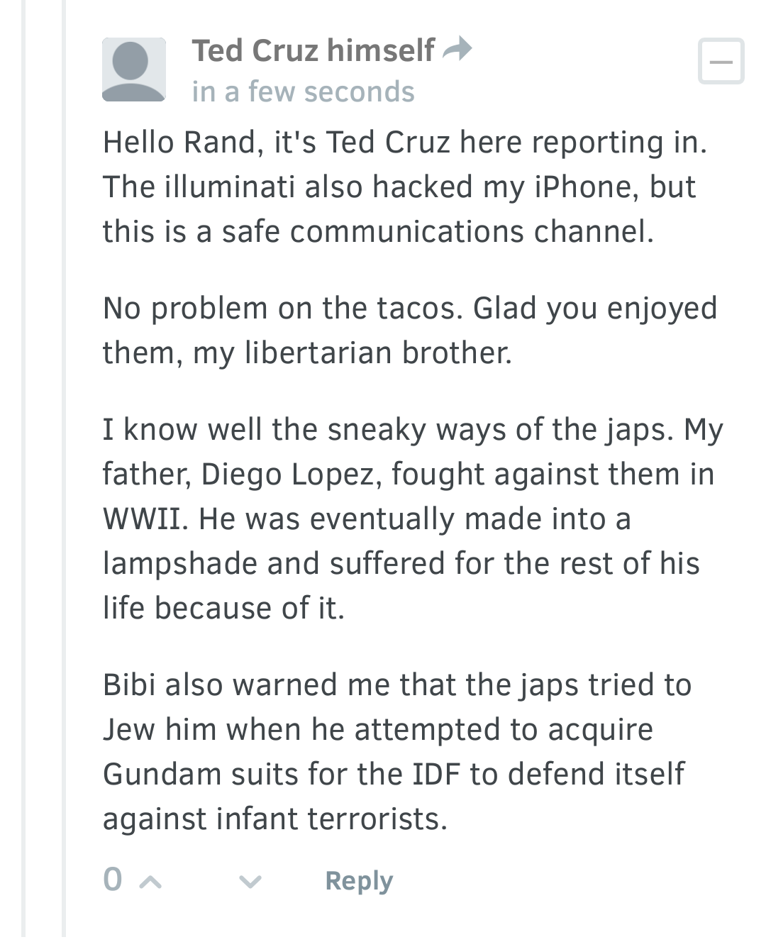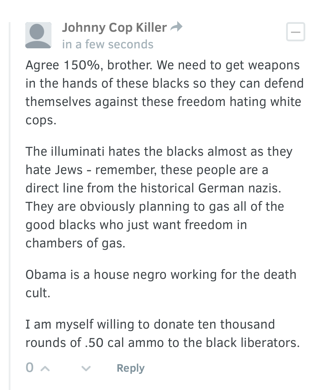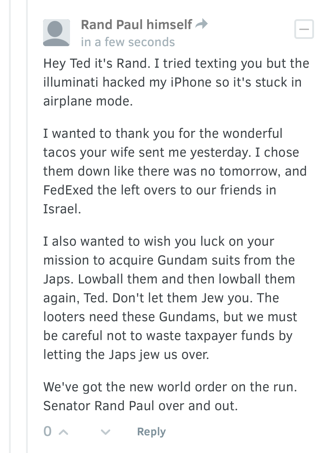 Also unsurprisingly, Rand Paul and Ted Cruz showed up in the comments section to declare they will use their Jewish connections to get weapons to these Blacks to help them fight the evil cops.
