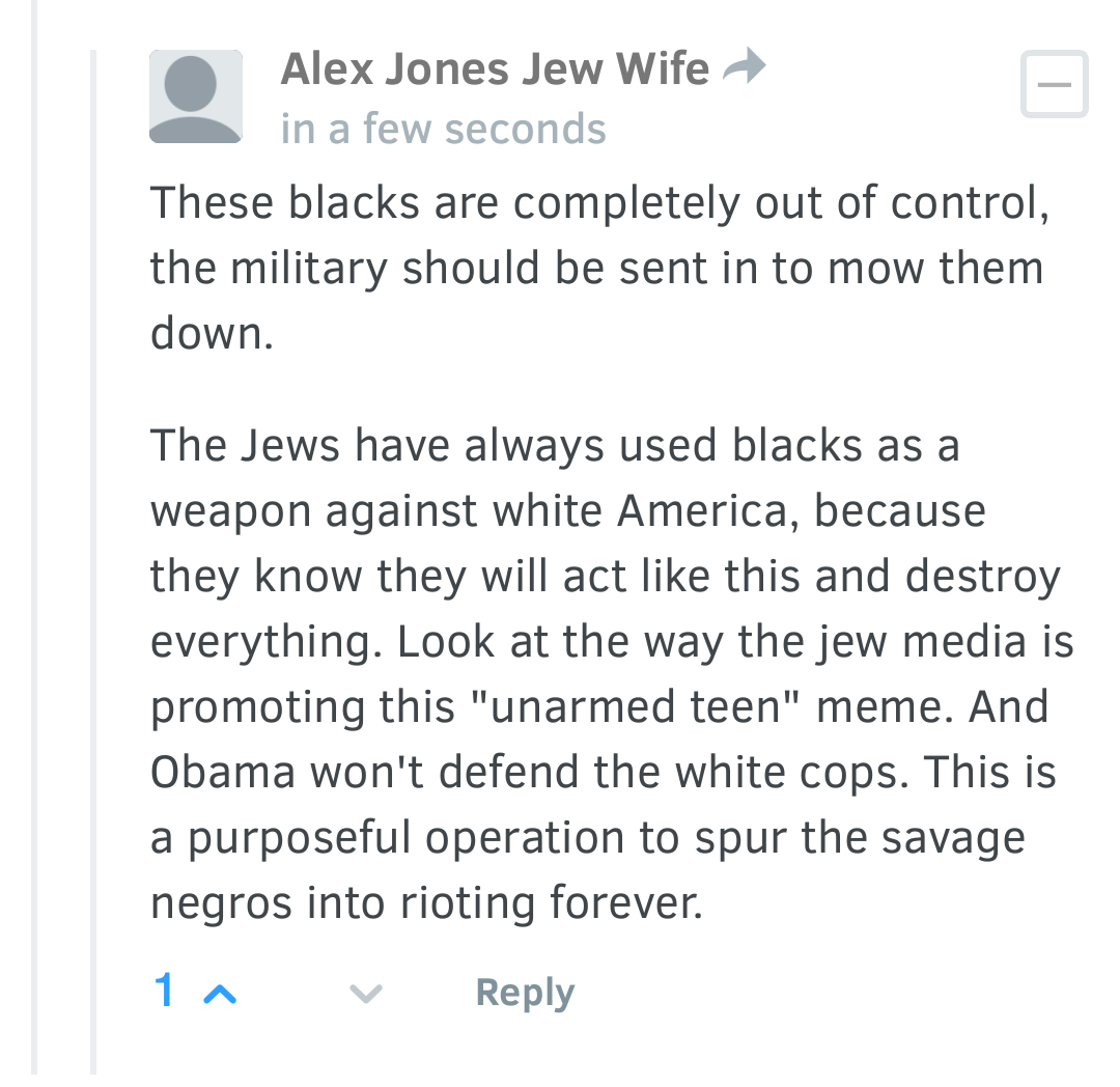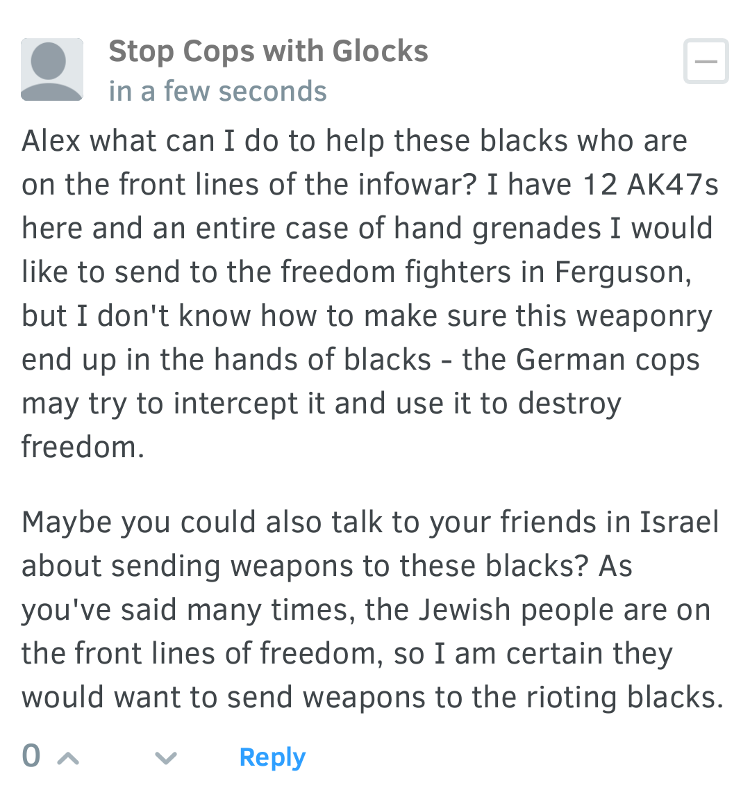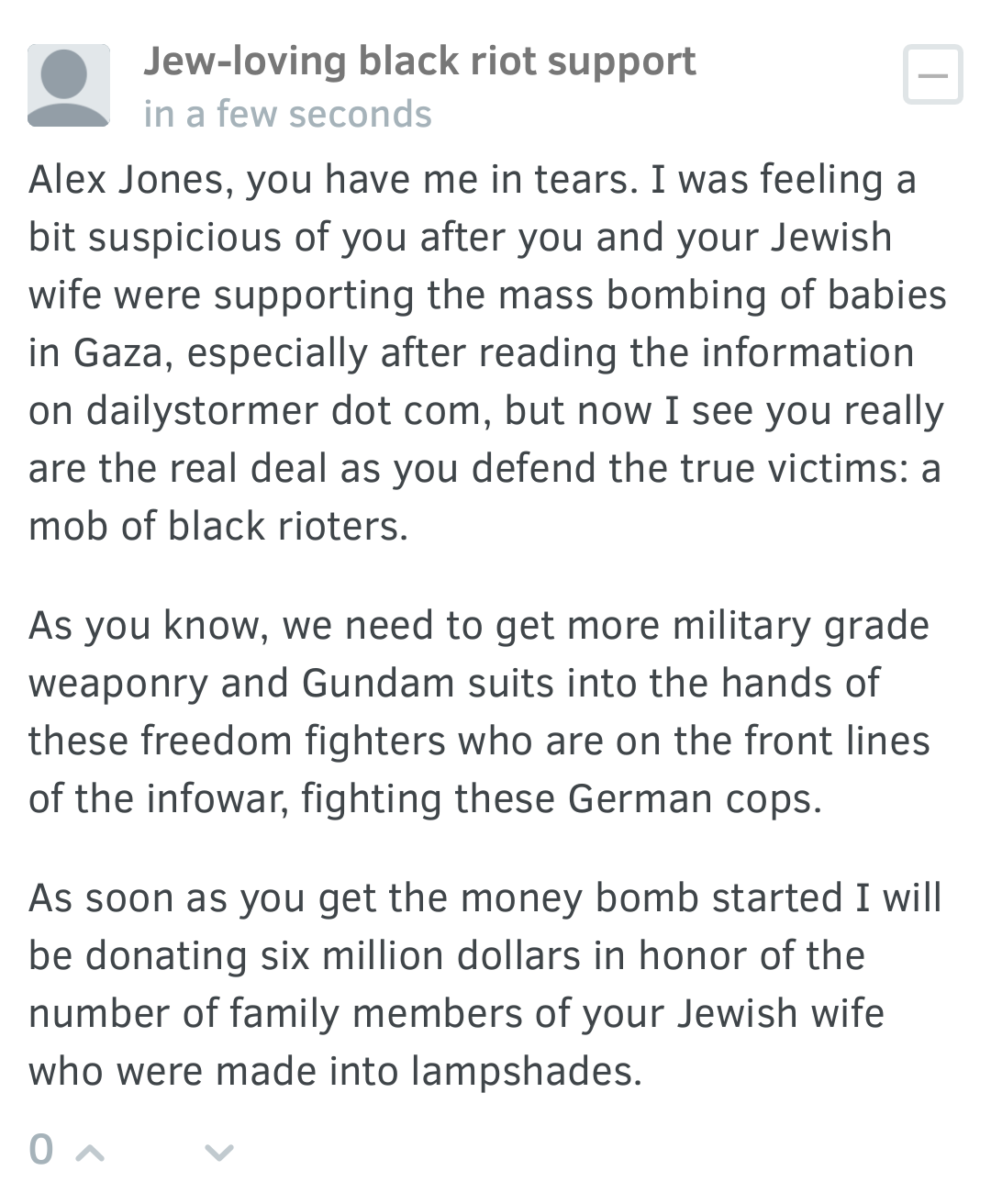 As Operation: Jew Wife continues, I was unsurprised to find in the comments section of Infowars articles about Ferguson that many of Alex Jones’ supporters are calling for a money-bomb to support the peaceful black rioters in Ferguson being armed with military grade weapons, Gundam suits, anthrax and weaponized Ebola.