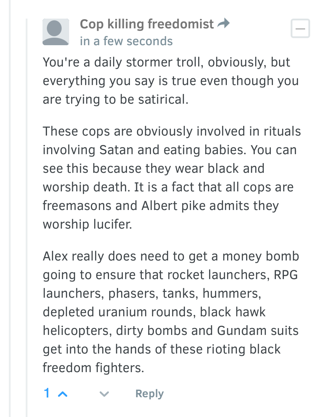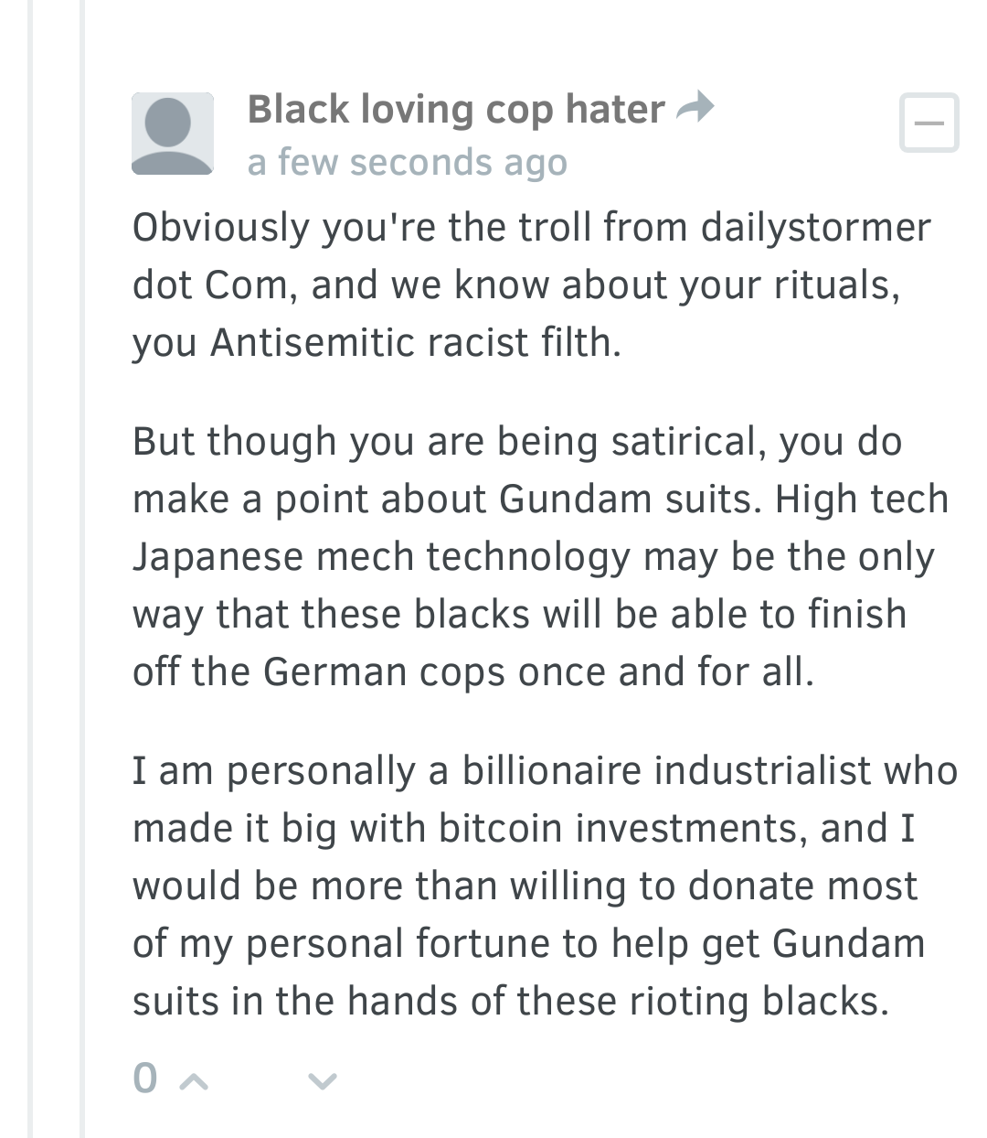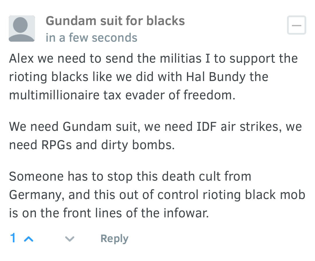 As Operation: Jew Wife continues, I was unsurprised to find in the comments section of Infowars articles about Ferguson that many of Alex Jones’ supporters are calling for a money-bomb to support the peaceful black rioters in Ferguson being armed with military grade weapons, Gundam suits, anthrax and weaponized Ebola.