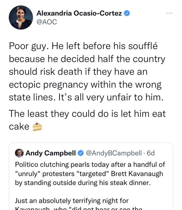 Many people were reminded of the time last week when AOC endorsed people rioting and chasing Supreme Court Justice Brett Kavanaugh out of a steakhouse.