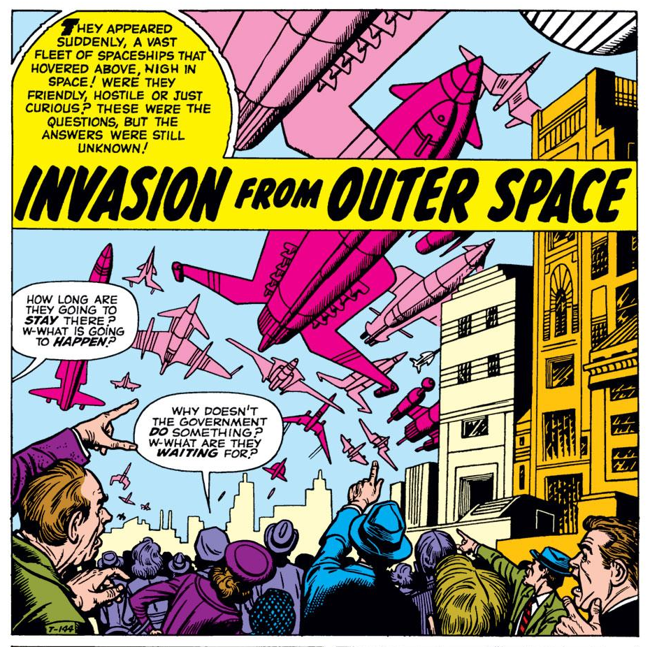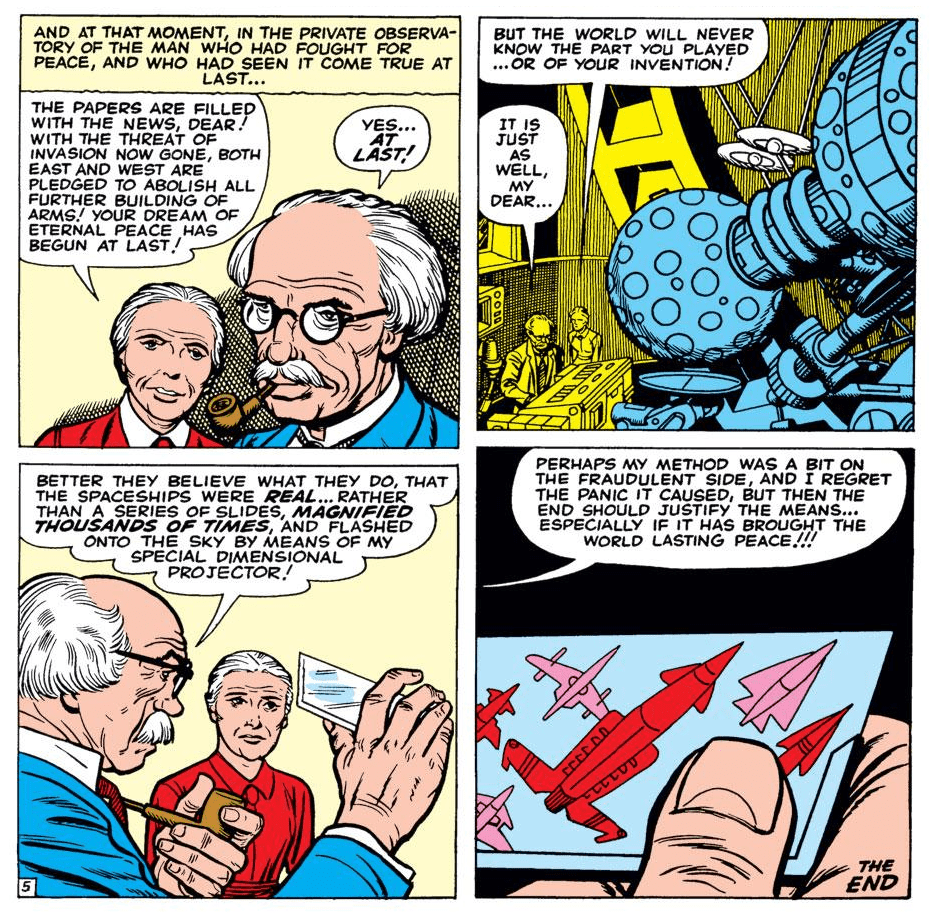 The first example of a fake alien contact event being used to form a global government that I’m aware of, and something which probably influenced Monast when he was putting together his theory, was “Invasion From Outer Space,” the lead story in Tales Of Suspense #2, published in 1959. This actually featured holograms.