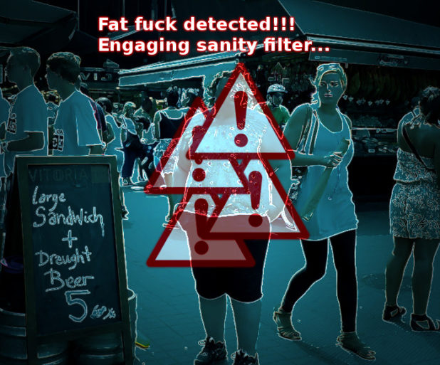 Some of you may suggest a law limiting clothing sizes to human levels, forcing all fat people wear garbage bags or window curtains.