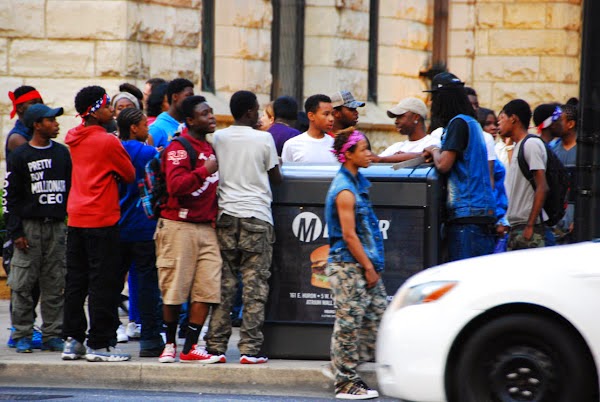 You could be walking along, enjoying the storefronts and decorative abstract art sculptures when all of a sudden the streets go from being predominantly White and middle-aged to Black and teenaged. After the blacks start some fights and break some stuff, the police units swoop in and start grabbing them by the dozens.