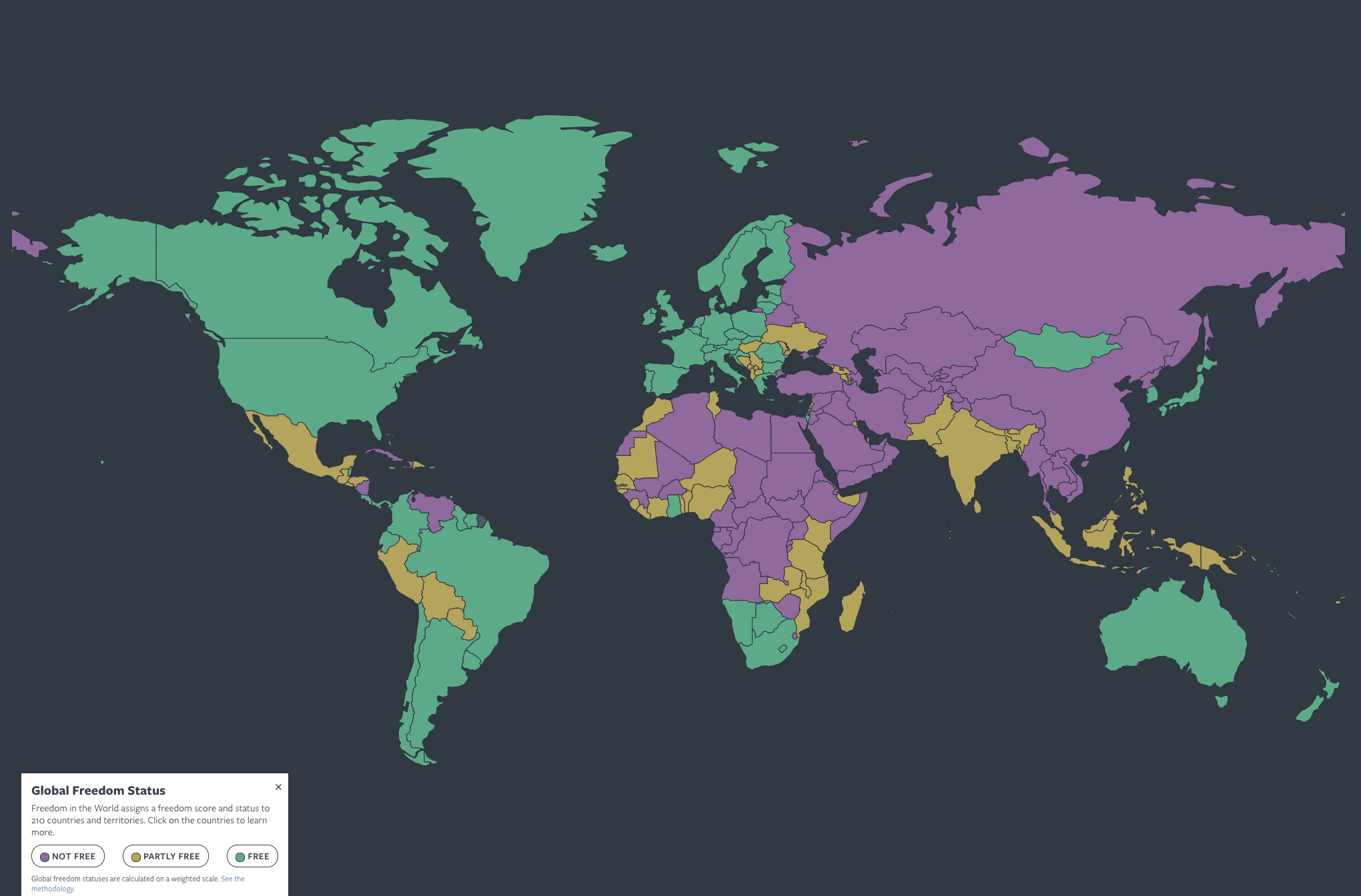 If you look at the Freedom House map of democracy, for example, you see a 1-1 overlap between “freedom” and “American influence.” This is because what they are actually ranking is American influence. According to this map, it is impossible to have freedom unless you are allied with the United States.