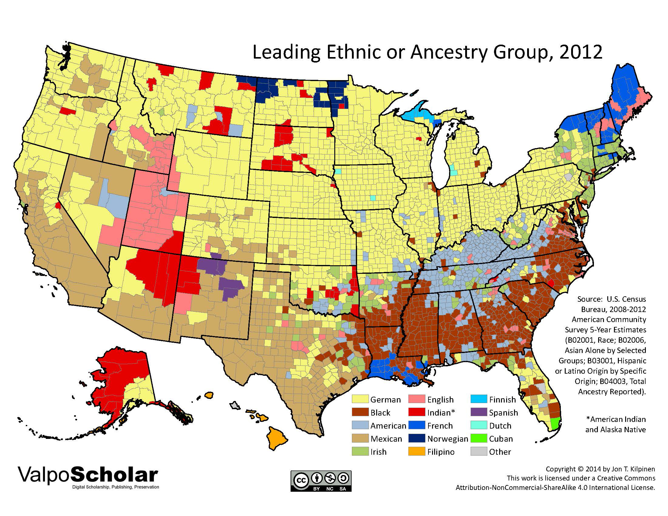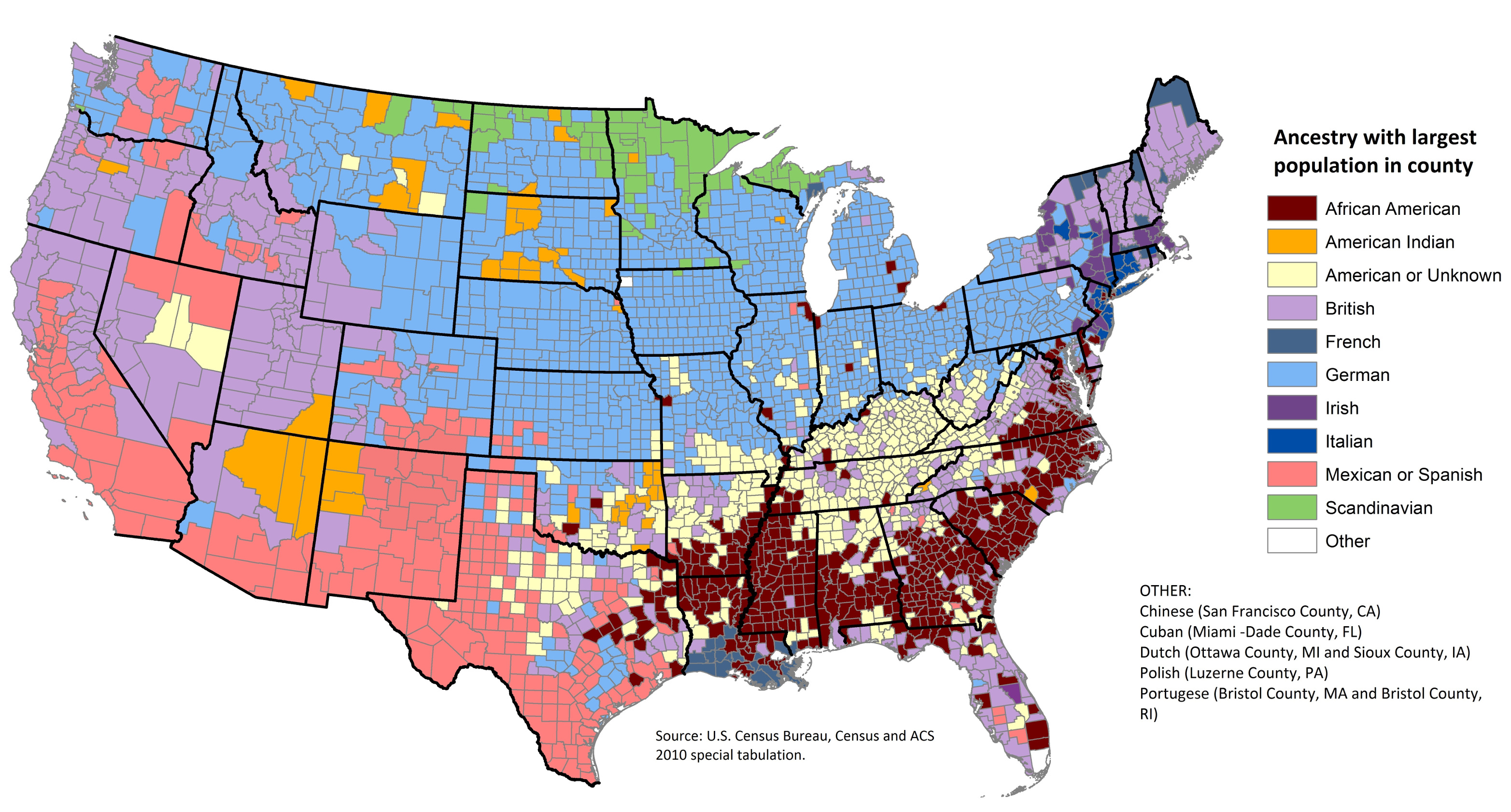 Leading ethnic groups by county, from the 2000 census: