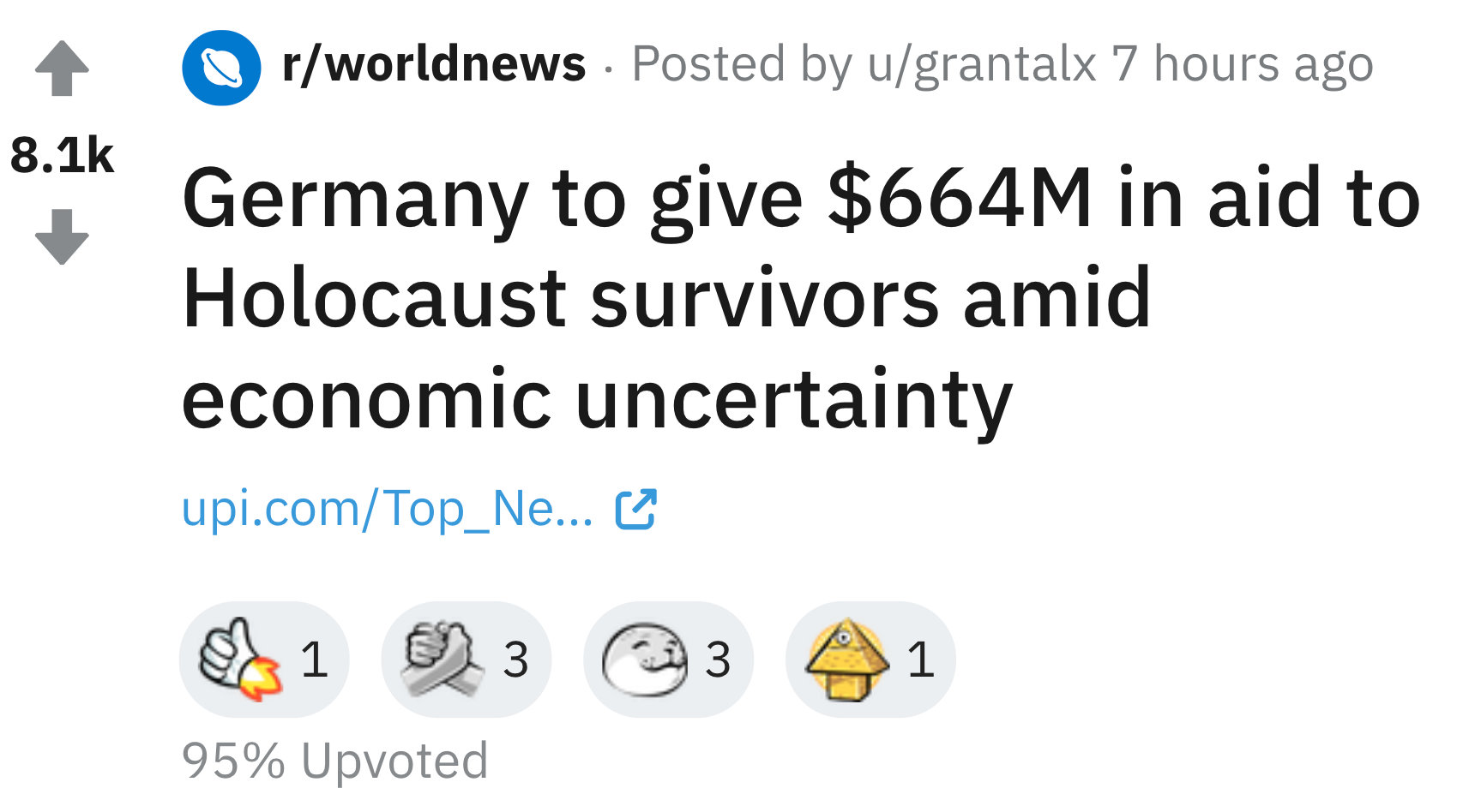 I’ve written recently about the fact that it has been shown that not only are all of the moderators on the big reddit boards Jews, but the people who play the role of curators are too. So it is no joke to get a jab at Jewish elitism in a headline that makes it to the top spot. (Yes, it could be read the other way, that “survivors” need the money because of the pandemic, but read it a bunch of times in a row. It’s clear it means “Jews are sucking blood from a dying country.”)