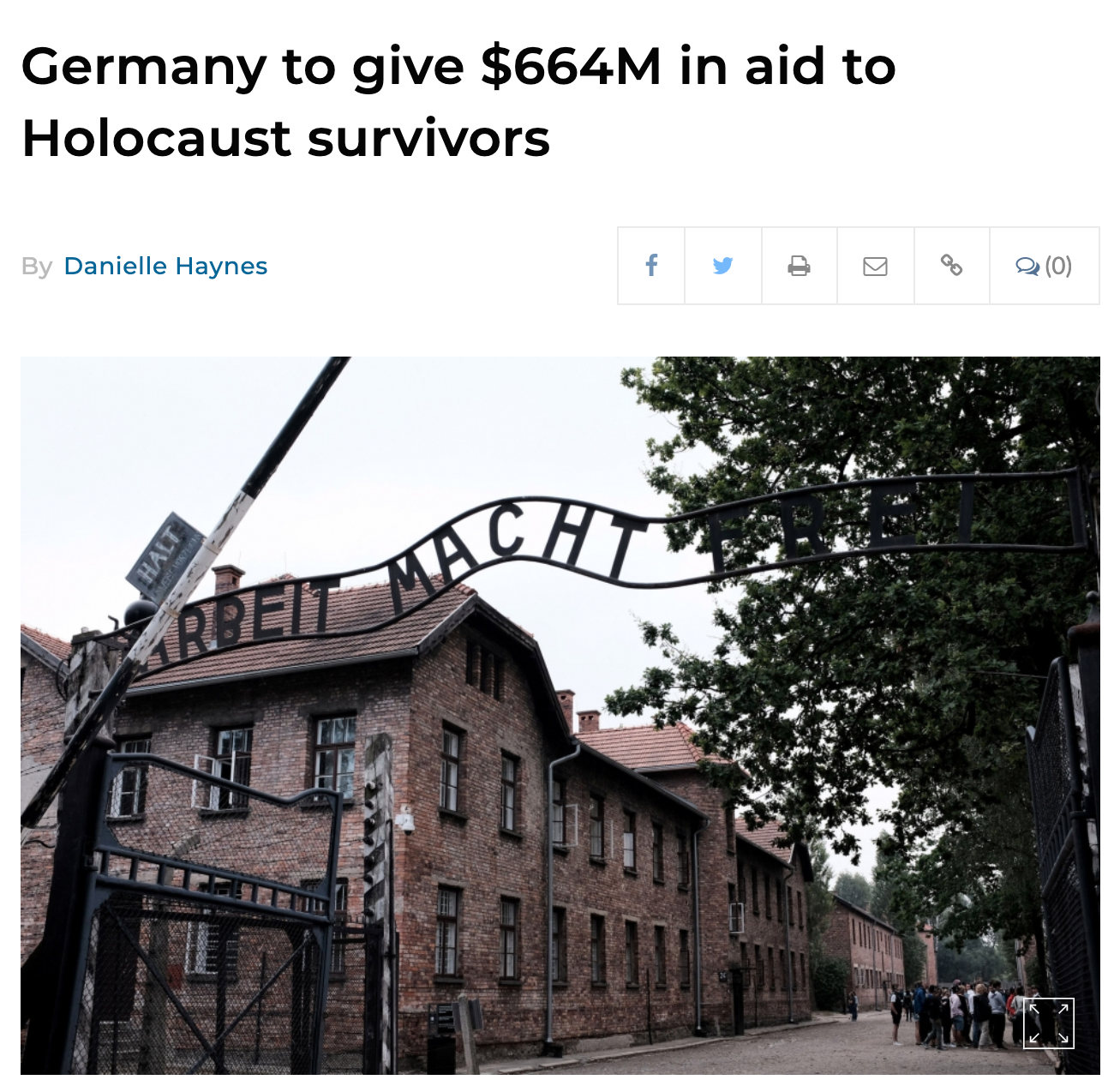 The implication here is that Germany is giving money to German Jews who have moved to other places, but Germany has for decades given huge sums of cash to Jews who have never been to Germany or any other country the Nazis occupied.