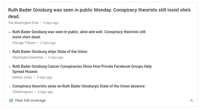 The Jewish media is claiming that we are conspiracy theorists for demanding to know information regarding the whereabouts of Jewish Supreme Court Justice Ruth Bader Ginsburg. Check out some of these Ginsburg related headlines that show up in a Google News search.