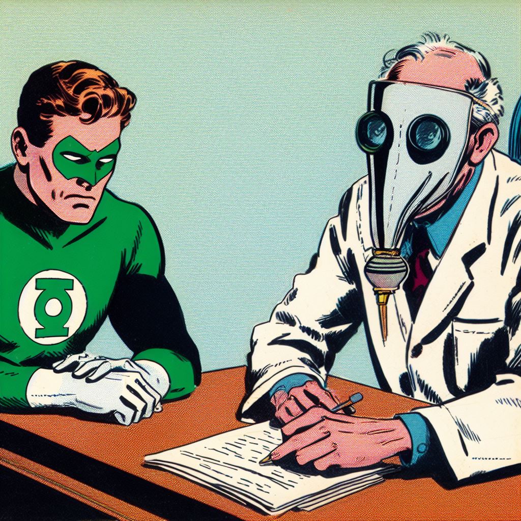 Most of the renders had the doctor in a green plague mask. Most of them also did the Lantern insignia correctly, however.