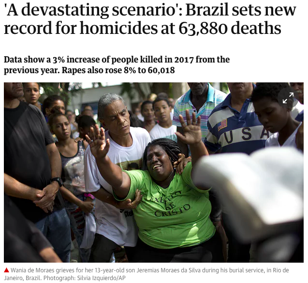 “It is a devastating scenario,” said Renato Sérgio de Lima, director of the forum, who said the homicide figures had been exacerbated by antiquated laws and police procedures and the growth in organised crime. Most victims were young, black men from poor urban areas, he said.