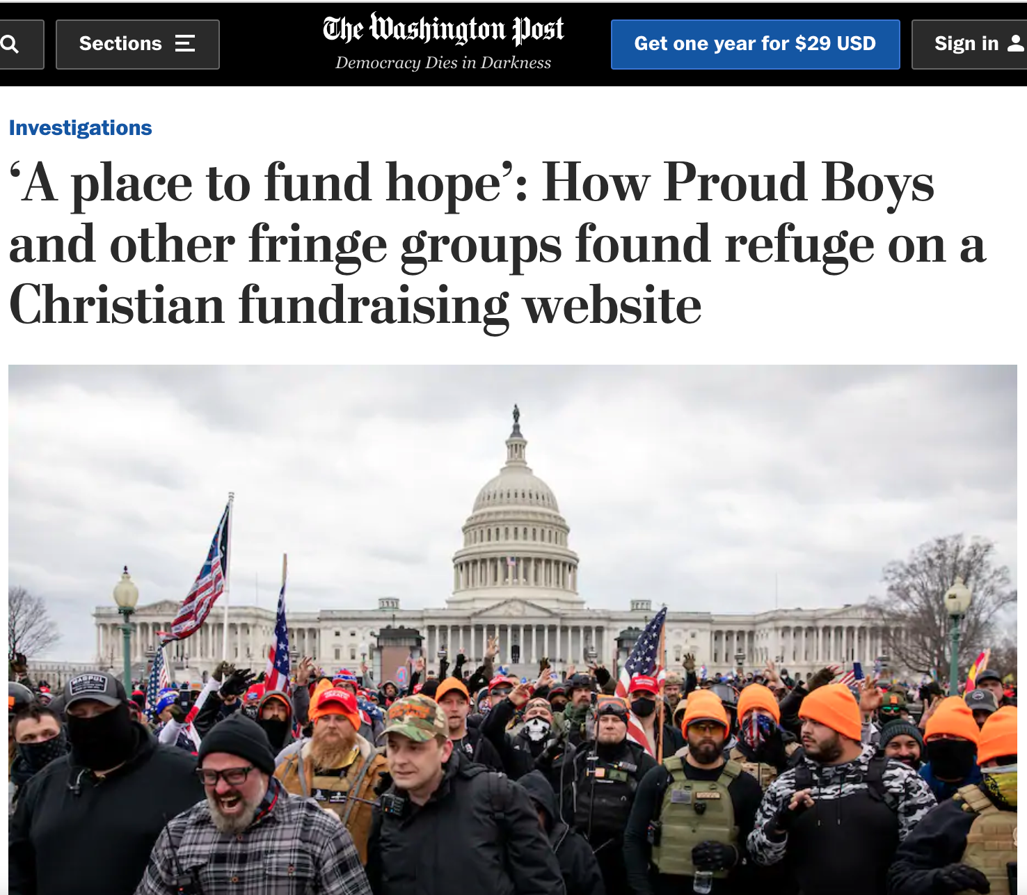 A review by The Washington Post shows that the self-described Christian website has become a refuge of sorts for outcasts and extremists, including fringe groups such as the Proud Boys as well as conspiracy theorists who seek to undercut the results of the presidential election by promoting debunked claims of fraud. Some of the users claim to have been booted from other crowdfunding websites for violating terms-of-service agreements.