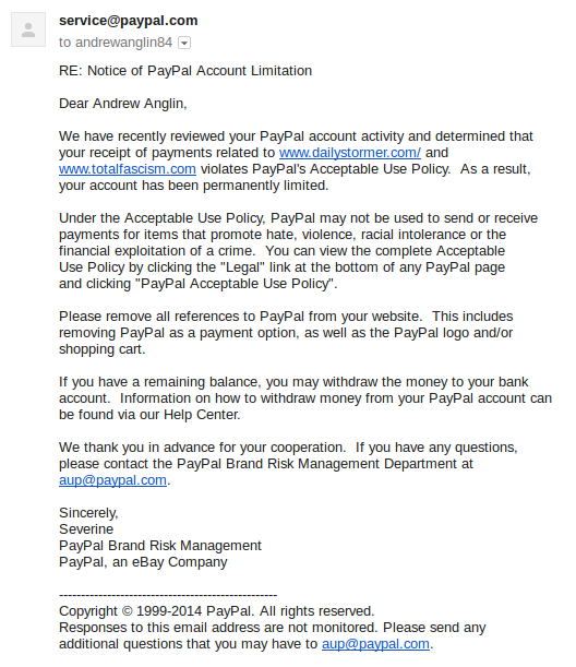 Though I was reluctant to speak of it until I had secured another donation option, PayPal has officially banned me for life from using their services because they disagree with my belief system.