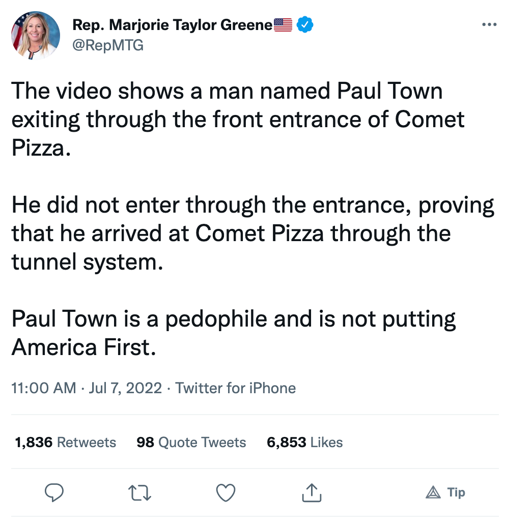 You may have heard some of the recent news about Paul Town. For example, Marjorie Taylor Greene tweeted about video proving that Paul Town had entered Comet Ping Pong, an infamous den of child molestation, through an underground tunnel system.