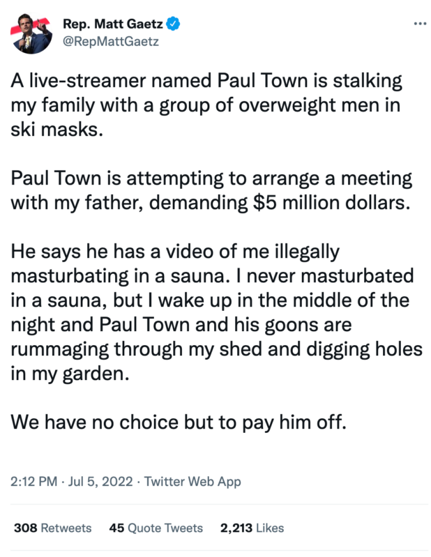 Meanwhile, Matt Gaetz has claimed that Paul Town is involved in a gang-stalking campaign against him, and is extorting his father for $5 million in relation to an alleged tape of Gaetz masturbating in a sauna. Gaetz further claimed that although he has never masturbated in a sauna, he has no choice but to meet Paul Town’s demands to prevent him from horsing around in his backyard in the night.