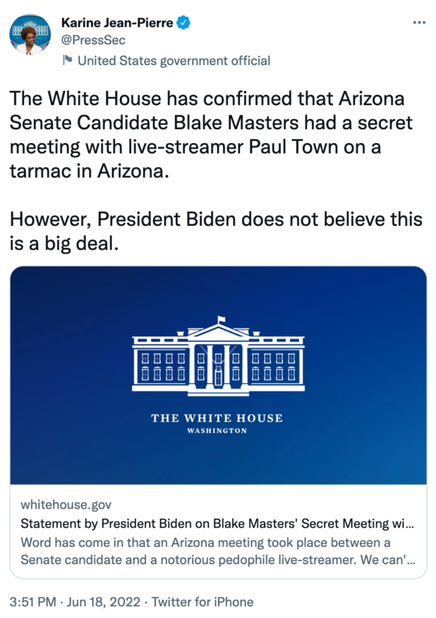 When the White House was finally forced to comment on the meeting, after Press Secretary Karine Jean-Pierre was continually badgered by Peter Doocy, they described it as “not a big deal.”