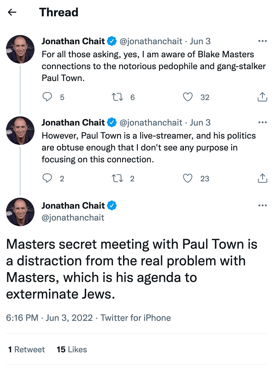 If Chait really was against Masters, why would he not bring up the documented connection to Paul Town, instead of some fantastical nonsense about a plan to exterminate the Jews?