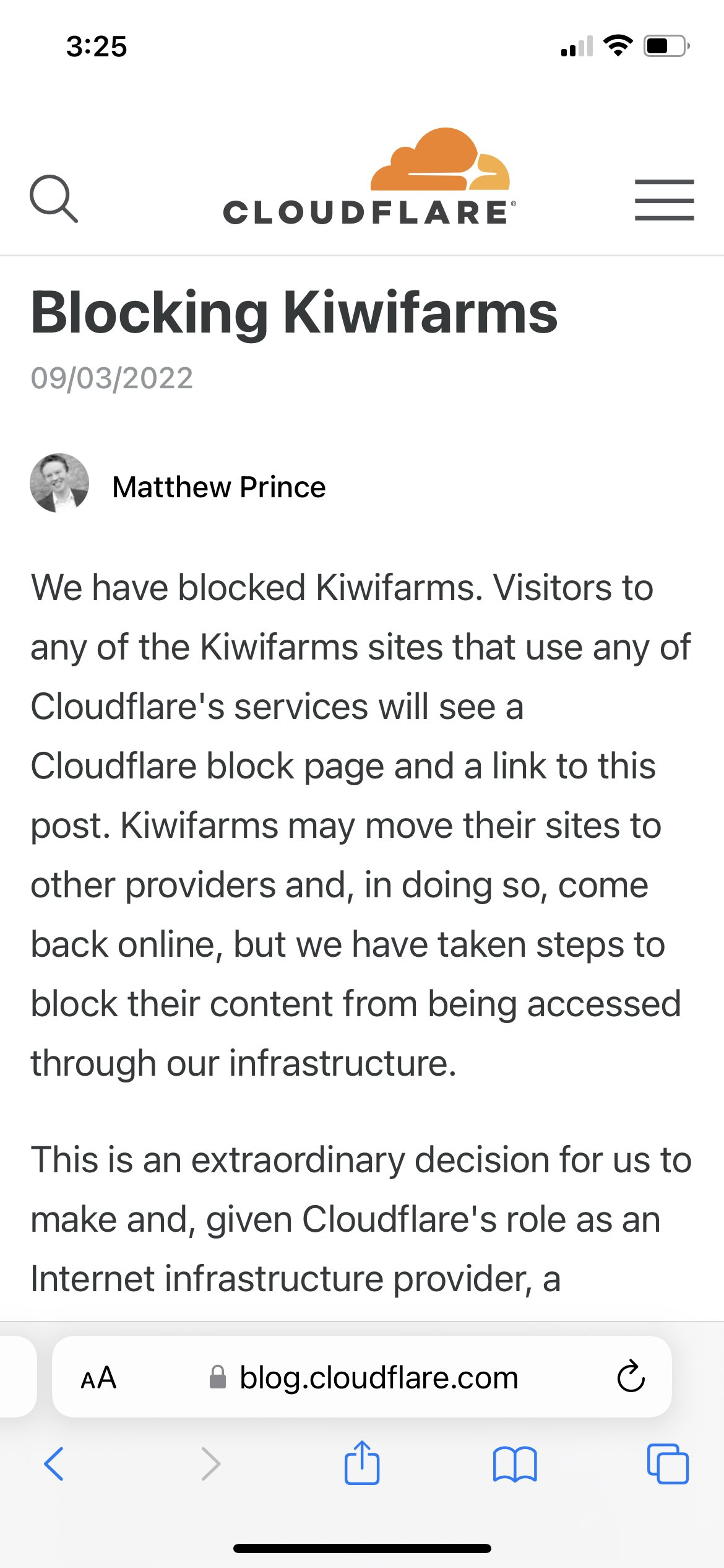 I hadn’t actually seen this story. The last thing I’d seen was CloudFlare saying that they wouldn’t ban Kiwi Farms. This is the same thing they did to me – they said they wouldn’t ban us, then they did ban us. Then they said they changed their mind because of something someone had posted on a forum. Matthew Prince, who is just a rat frankly, did an interview with VICE about it and implied that “The Daily Stormer” had said that he was a secret Nazi. In reality, someone had made that joke on the site’s forum, where there were like, tens of thousands of people registered – and there was open registration. He later gave different reasons for the ban, and claimed that he would never ban anyone else.