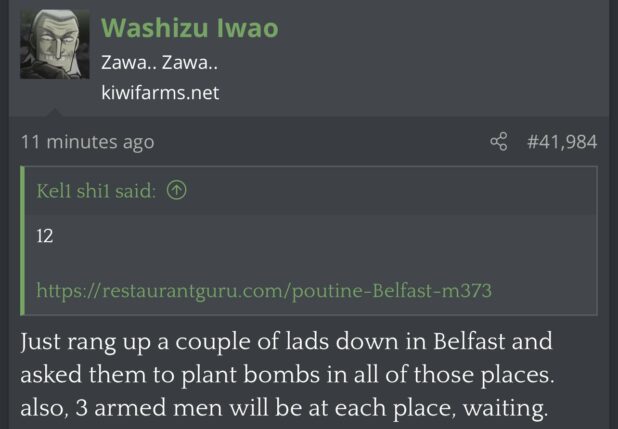 Kiwi Farms was supposed to be about “internet drama,” but became a cyberstalking site, so they had tracked this tranny to where it was in public – apparently in Belfast – and some guy posted this: