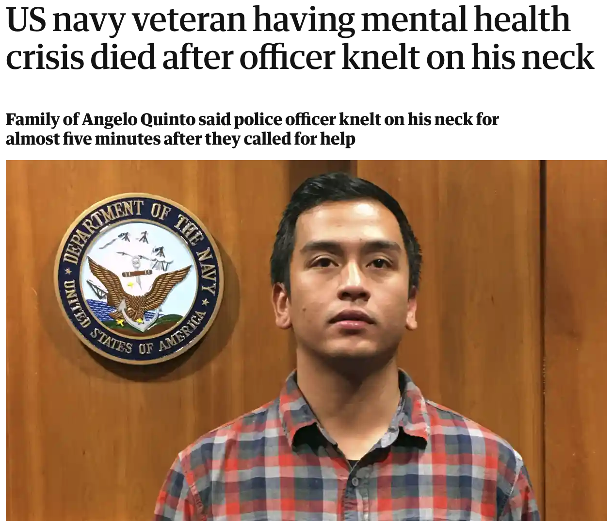 A US navy veteran who was experiencing a mental health crisis died after a police officer called out to help him knelt on his neck for several minutes, asphyxiating him, lawyers for his family have said.