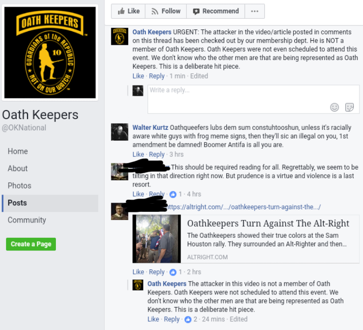 In response to an article on AltRight.com covering the Houston assault, the group announced on their Facebook page that they were not responsible for this, and that none of the people there claiming to be Oath Keepers and wearing Oath Keepers gear, were actual Oath Keepers.