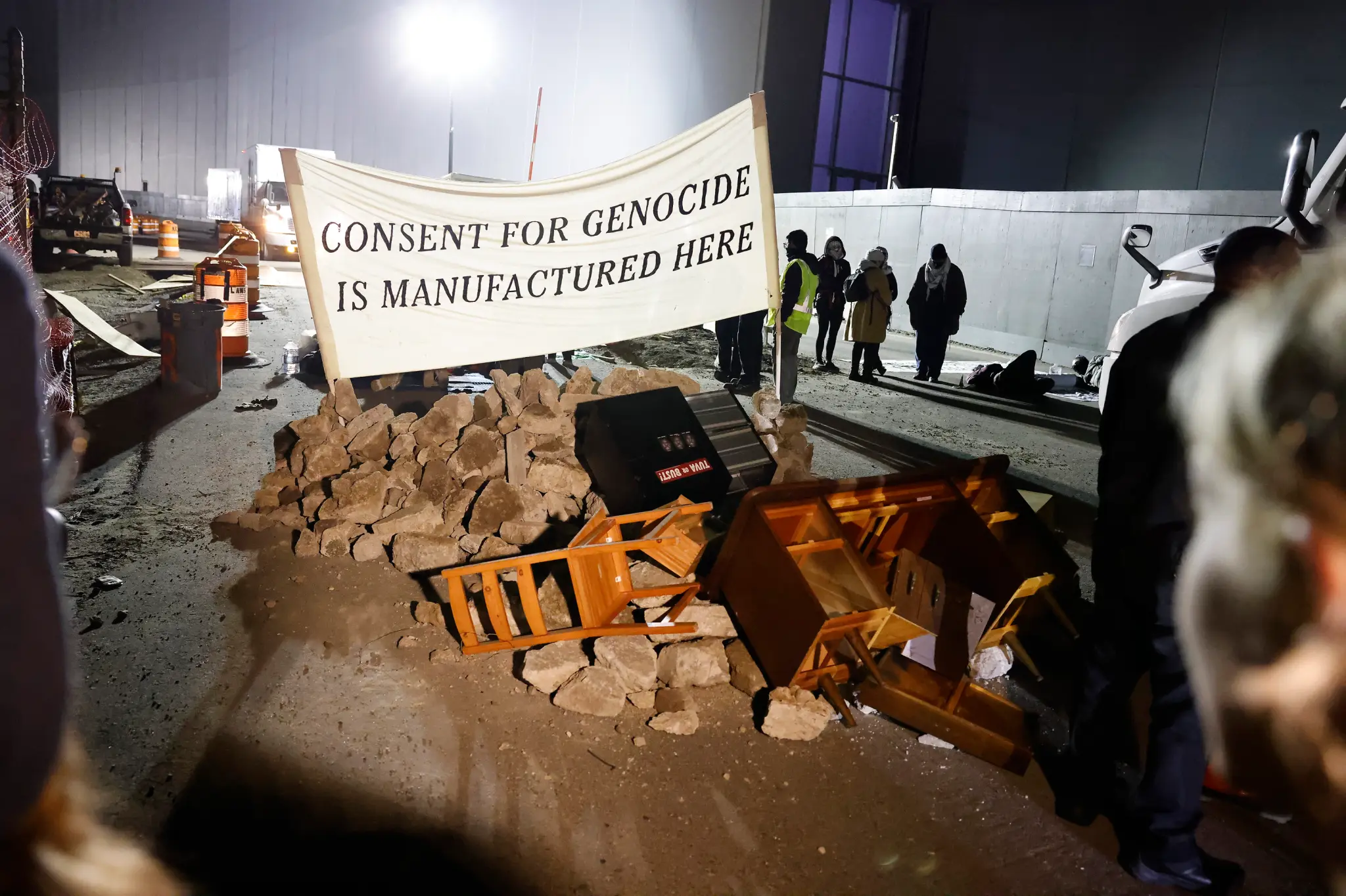 The protesters descended on the 300,000-square-foot printing hub in College Point — which also publishes the New York Post and is one of the largest in the US — shortly before 1 a.m. and littered the access road to the building with rocks and other debris to prevent trucks from collecting newspapers for morning delivery.