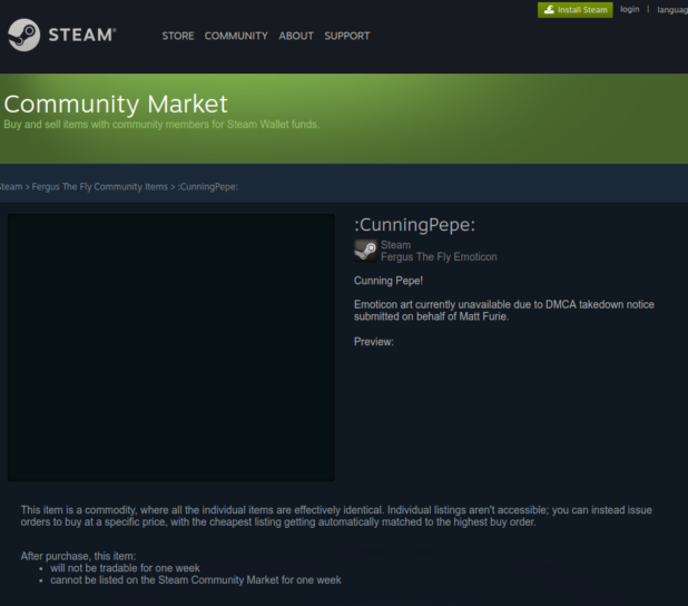 Furie’s lawyer August Louis Tompros told Kotaku that he didn’t proactively single out Steam. “A Steam user let us know that there were Pepe images being sold on the site, and that they were being used on that site by people in connection with hateful speech. We asked Steam to take those down, and it appears that it has done that.”