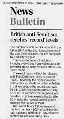 The CST’s figures on ‘anti-Semitism’ are padded-out with reports of school-children’s name-calling and other such trivia. The English had to put up with a lot worse from the Scots during the course of the recent Scottish independence referendum.