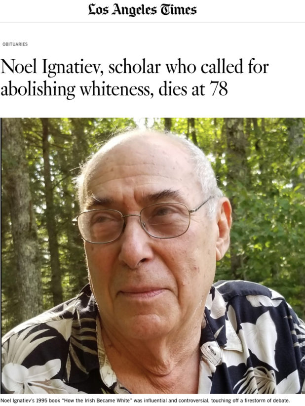 Noel Ignatiev, a former steelworker who became a historian known for his work on race and class and his call to abolish “whiteness,” died at Banner-University Medical Center Tucson on Saturday. He was 78. The cause was an intestinal infarction, according to Kingsley Clarke, a longtime friend.