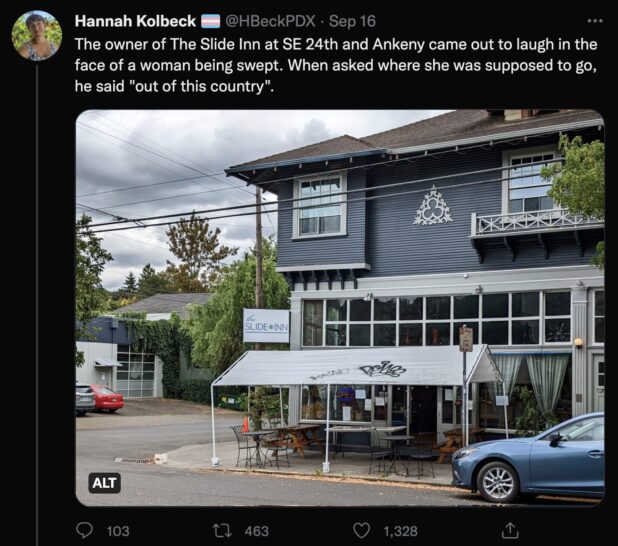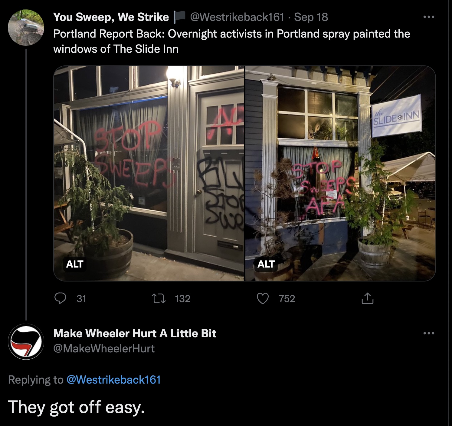 Here is a post by an #Antifa member in Portland who was likely involved in the vandalism of The Side Inn restaurant. “AFA” on the window stands for their group, Antifascist Action
