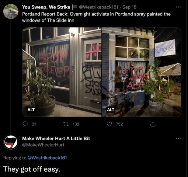 #Antifa accounts in #Portland have been using Twitter to direct comrades to vandalize businesses in Portland that allegedly remove vagrants or encampments on their property. Antifa incite violence by embellishing claim or lying. They already carried out vandalism on a restaurant. pic.twitter.com/Rc9dOYHOYJ