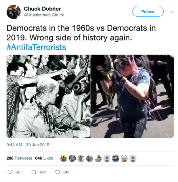 For those who don’t know, it’s Andy on the right and the one on the left is a white student pouring a milkshake on a black civil rights protester. It must have been a Democrat back then – because Democrats are the real racists. And maybe Antifa is somehow racist or whatever. After all – Andy Ngo is a gay gook.